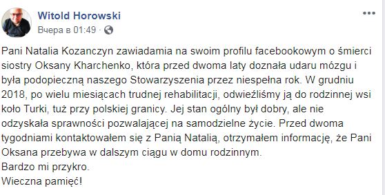Умерла Оксана Харченко, которую в 2018 году польский работодатель бросил парализованной после инсульта на скамейке. Об этом сообщил бывший Почетный консул Украины в Познани, председатель общественно-культурного общества Польша-Украина Витольд Хоровский в Facebook.