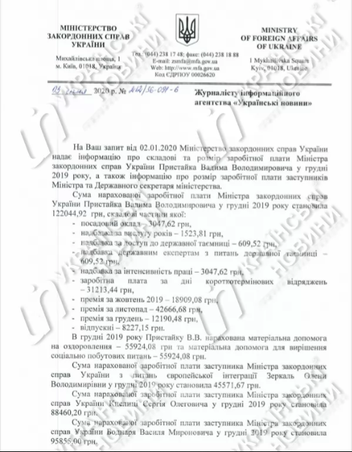 В конце 2019 года министр иностранных дел Вадим Пристайко заработал 234 тыс. гривен, в то время как за ноябрь он получил 68,2 тыс. гривен. Зарплата его заместителей - от 45,5 тыс. до 96 тыс. гривен, государственного секретаря министерства - 128 тыс. гривен.