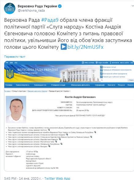 Другим решением парламент избрал нардепа от фракции Слуга народа Андрея Костина председателем комитета по вопросам правовой политики. Он сменил на этом посту Венедиктову.