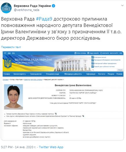 Верховная Рада досрочно прекратила полномочия народного депутата Ирины Венедиктовой в связи с ее назначением временной исполняющей обязанности директора Государственного бюро расследований. Об этом сказано в сообщении Рады в Twitter.