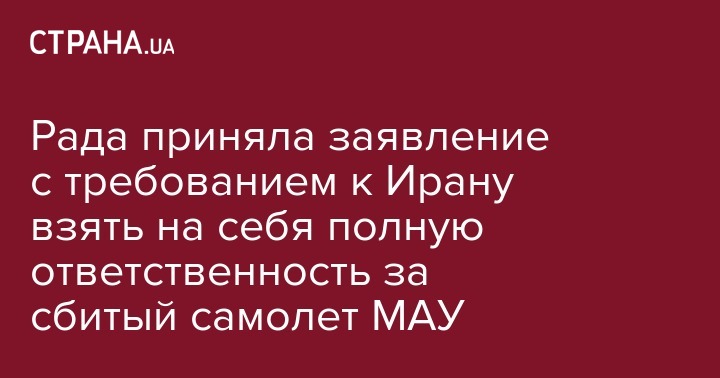 Верховная Рада приняла заявление, в котором призывает исламскую республику Иран взять на себя полную ответственность за сбивание пассажирского самолета МАУ из 176 людьми на борту и выплатить все компенсации.
