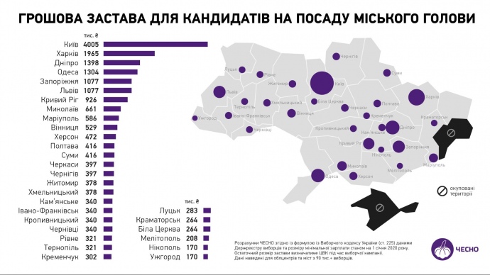 "Расчеты на основе формулы с Избирательного кодекса свидетельствуют, что размер залога для кандидата в мэры облцентра или большого города от 90 тысяч избирателей будет составлять не менее 170 000 гривен (Ужгород)", - говорится в сообщении.