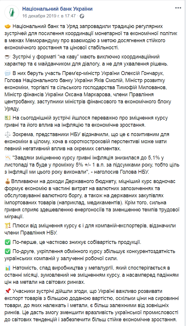 О встрече Гончарука, Рожковой и Маркаровой, чья запись оказалась слитой в Интернет, где они нелицеприятно отзывались о президенте и обсуждали как ему объяснить рост курса гривны, оказывается, описывалась в Facebook НБУ в тот же день - 16 декабря.