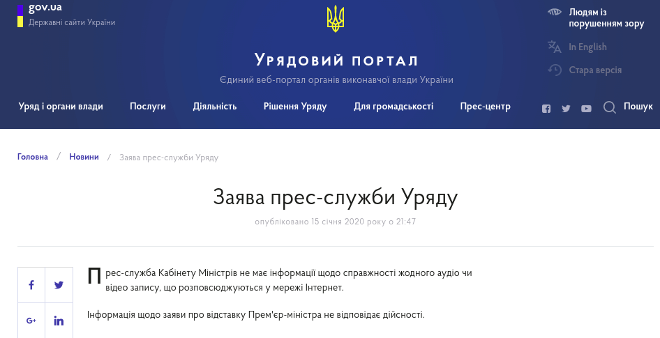 "Кабинет Министров не располагает информацией о подлинности ни аудио или видео записи, распространяются в сети Интернет. Информация об отставке Премьер-министра не соответствует действительности", - говорится в сообщении, опубликованном на официальном сайте украинского правительства.