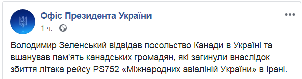 Президент Украины Владимир Зеленский 15 января посетил посольство Канады в Украине и почтил память канадских граждан, погибших при крушении рейса PS752 в Иране. Об этом сообщает в Facebook Офис главы государства.