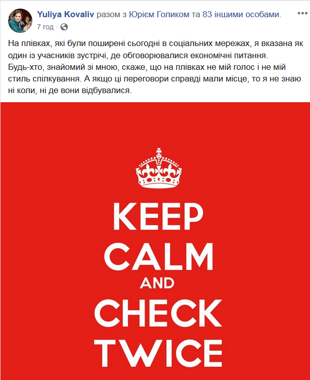 Так, например, Юлия Ковалив, заместитель руководителя Офиса президента Андрея Богдана публично заявила, что голос на записи не ее. Об этом она написала в своем Facebook, сопроводив свой комментарий призывом Keep calm and check twice (Успокойся и проверь дважды - Ред.).