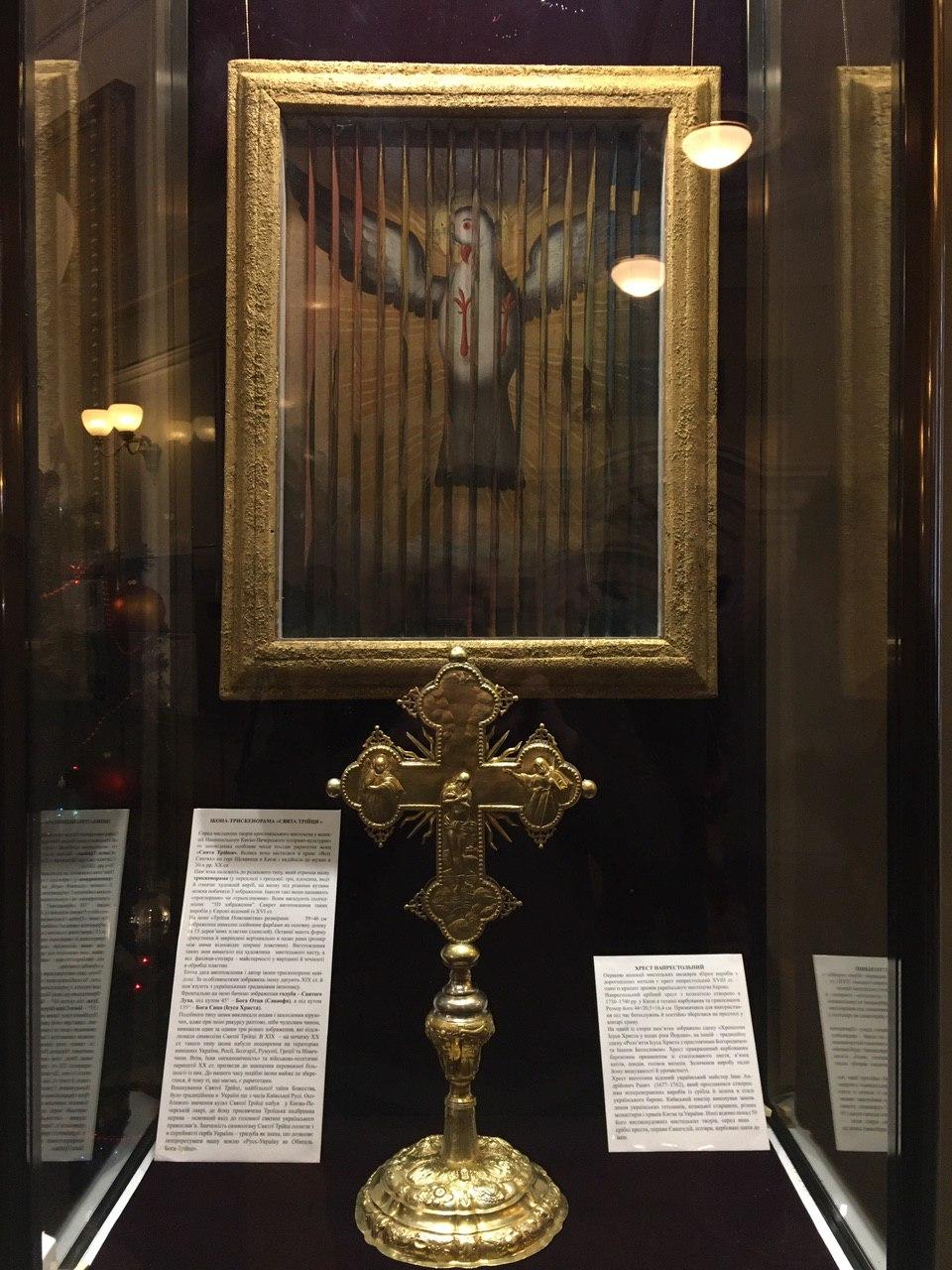 В экспозицию вошла икона-трисценорама "Святая Троица" и настольный крест XVIII века.