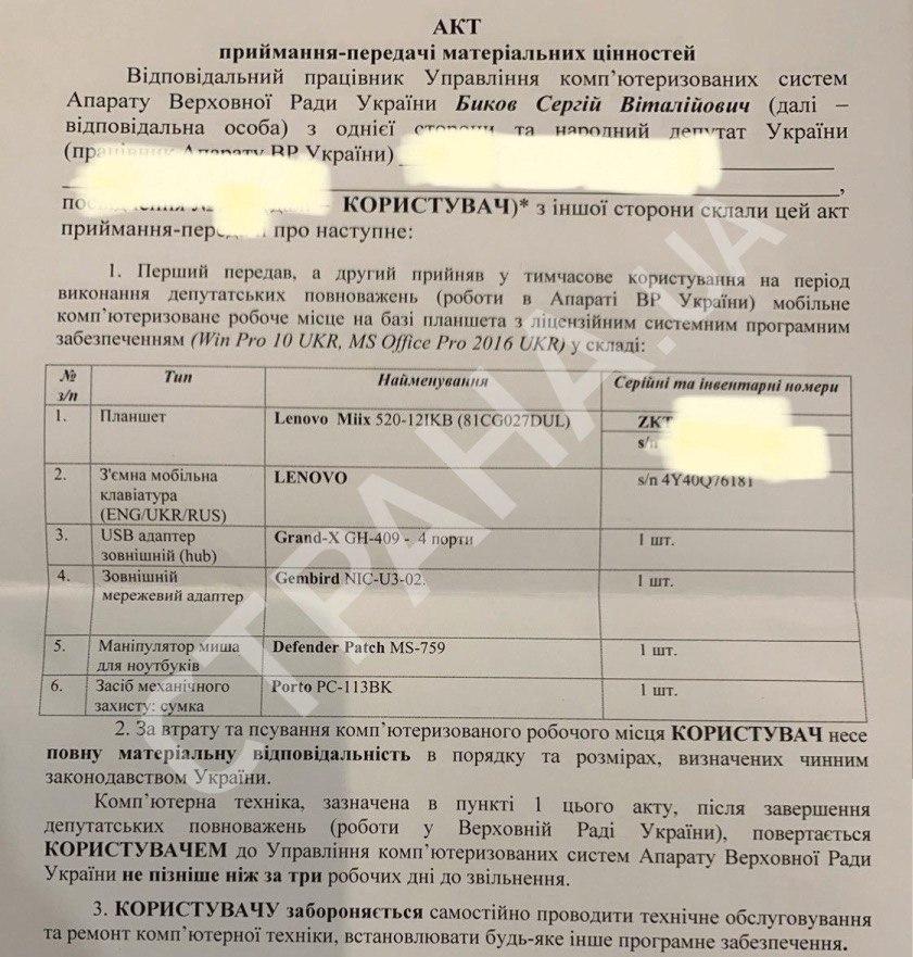 В акте приема-передачи матценностей, который подпиcали нардепы, указывается, что к планшету Lenovo Miix 520-12IKB (81CG027DUL) также прилагается клавиатура, мышка, USB-адаптер, сетевой адаптер и сумка. Планшет обеспечен лицензионным программным обеспечением.