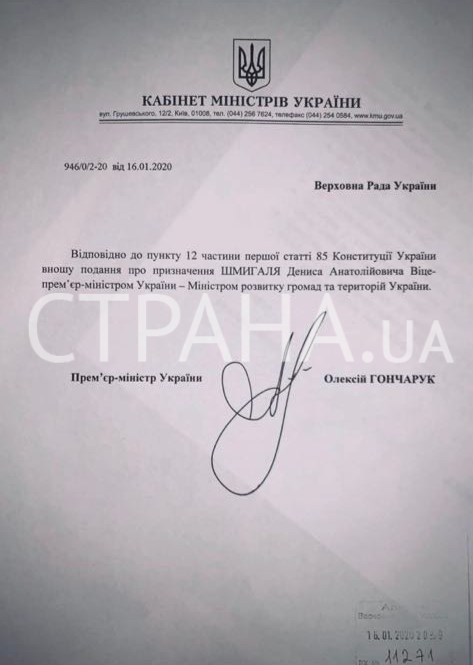 Премьер-министр Украины Алексей Гончарук подал в Верховную Раду представление о назначении вице-премьер-министром Украины - министром развития общин и территорий Украины Дениса Шмыгаля. Фото документа оказалось в распоряжении "Страны".