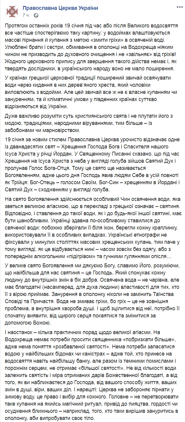 У Епифания посетовали, что в течение последних лет 19 января все чаще в водоемах устраиваются массовые ныряния и купания с целью "смыть грехи" в освященной воде. В ПЦУ утверждают, что омовение в проруби на Крещение никоим образом не приводит к духовному очищению. И никакие церковные правила, по мнению ПЦУ, не предписывают купания. К тому же, как считают в ПЦУ, у украинского народа они не были распространены.