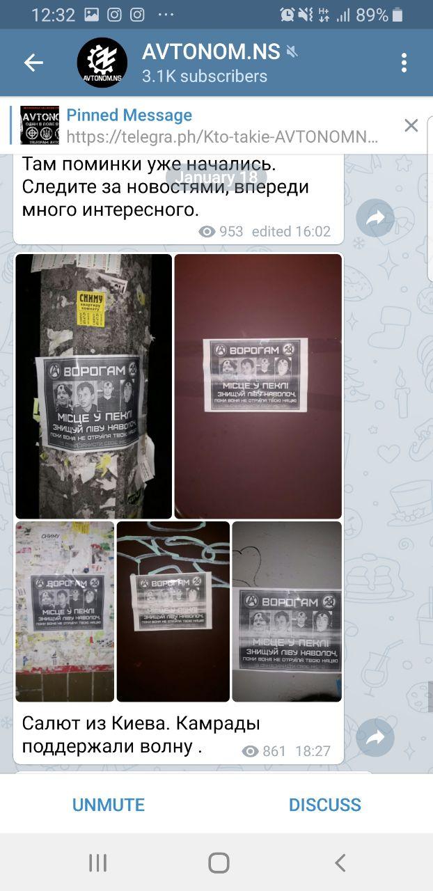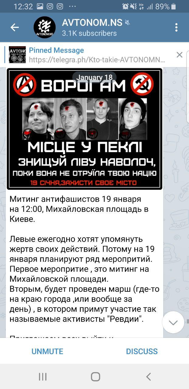 Накануне в телеграм-канале националистической направленности были опубликованы сообщения с призывом ликвидировать участников антифашистской акции. Утром на майдане независимости появился флаг с надписью "Убить антифашиста".