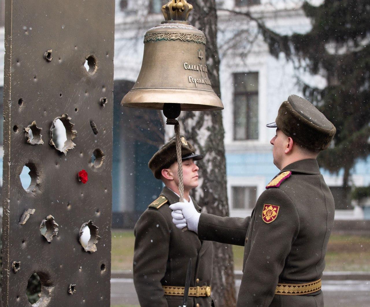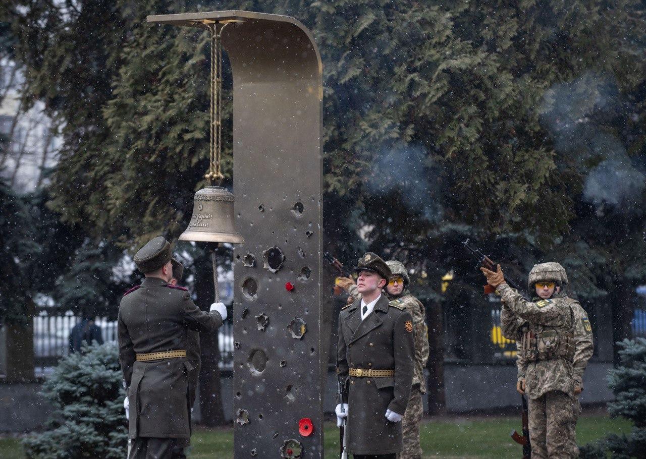 Глава государства возложил цветы к подножию памятного колокола вместе с членами семей погибших военных. Также Владимир Зеленский пообщался с семьями военных.