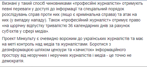 Он также добавил, что проект Минкульта является очевидно враждебным к украинским журналистам и нацелен на установление контроля над медиа и журналистами.