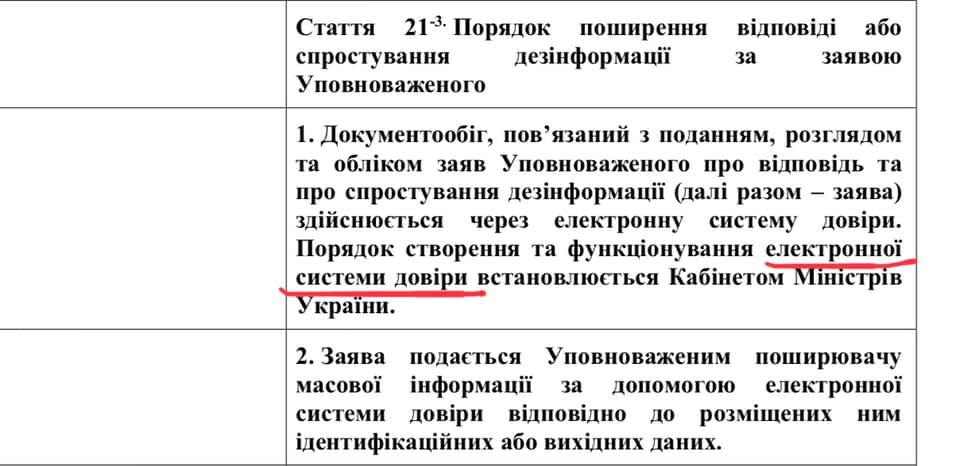 Государство будет предоставлять СМИ "Индекс доверия" (будет действовать один год). О доверии говорится и в работе Уполномоченного по вопросам информации. Именно через "электронную систему доверия" он потребует в СМИ "опровержения дезинформации" и будет пугать следующим судебным преследованием. Кстати, у Уполномоченного будет право просить заблокировать доступ к любому сайту в Украине или, например, телеграмм-каналу, если он анонимный, что нарушает требования по прозрачности распространителей массовой информации в сети Интернет (статья 55, правка в Закон об информации).