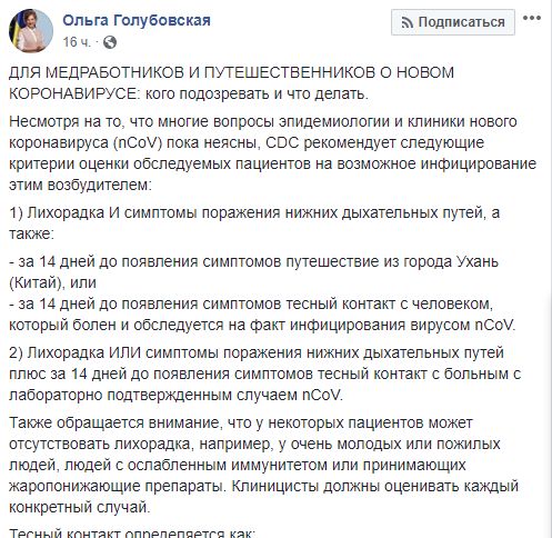 Известный украинский инфекционист Ольга Голубовская написала в Facebook пост о коронавирусе с подробніми рекомендациями: "Несмотря на то, что многие вопросы эпидемиологии и клиники нового коронавируса (nCoV) пока неясны, CDC рекомендует следующие критерии оценки обследуемых пациентов на возможное инфицирование этим возбудителем: