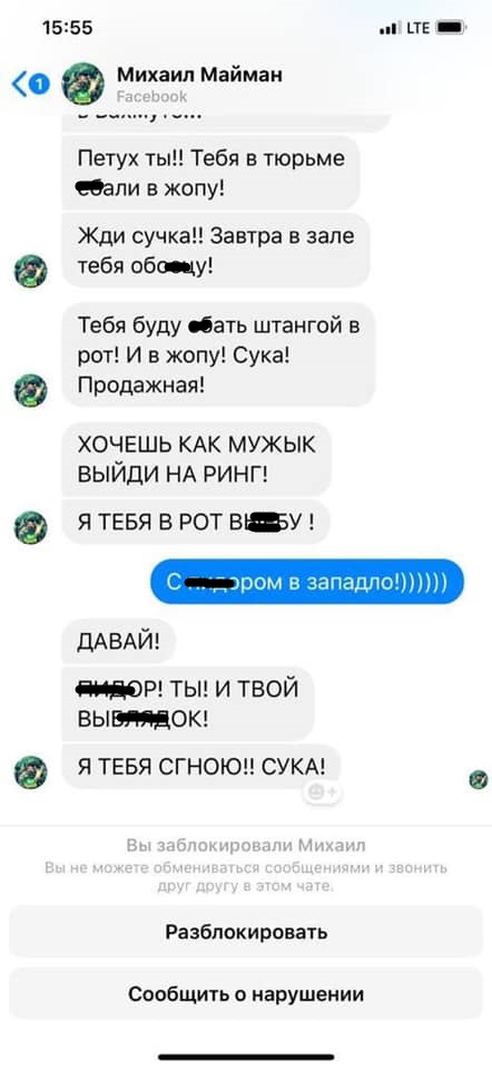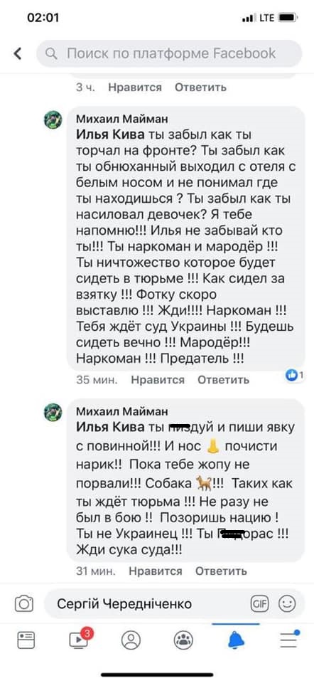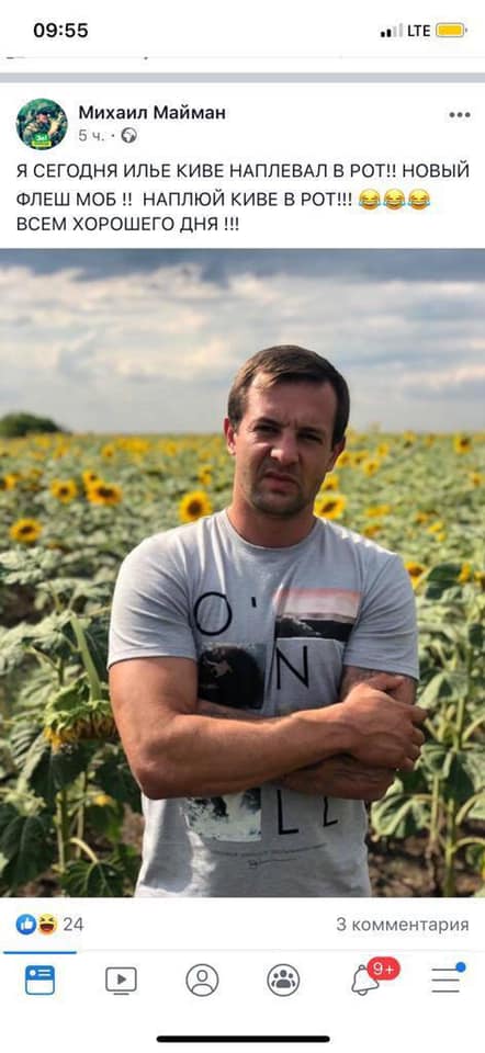Илья Кива также прикрепил к своему посту скрины переписки с неприятелем и его аккаунт в соцсети, где Михаил Майман открыто говорит о том, что объявил своеобразный флешмоб по отношению к нардепу: "сегодня Илье Киве наплевал в рот. новый флеш моб. Наплюй Киве в рот. Всем хорошего дня", - так выглядит одно из заявлений напавшего на Киву.