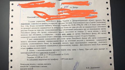 И все же эта история с банковскими справками появилась не просто так. "Страна" связалась с нардепом Максом Бужанским. Он предоставил нам фото уведомления от ПФ, которую получил один из пенсионеров Днепра. В ней говорится, что пенсионер должен явиться на прием и написать новое заявление. "Согласно постановлению Кабмина от 30.08.1999 года №1596, если суммы пенсии получаются по доверенности более года или не получаются с поточного счета больше года, уполномоченный банк должен сообщить об этом соответствующему органу Пенсионного фонда или социальной защиты населения не позже 25 числа месяца, в котором возникли такие обстоятельства, а получатель - подать новое заявление в орган ПФ", - сказано в уведомлении.