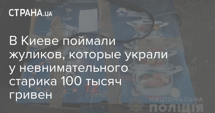 В Киеве задержали двух мошенников, которые ограбили 81-летнего пенсионера на 100 тысяч гривен, представившись продавцами посуды. Двое незнакомцев встретили пенсионера на улице и проследовали до квартиры жертвы, поскольку у него не было с собой денег. Оперативники задержали грабителей "на горячем".