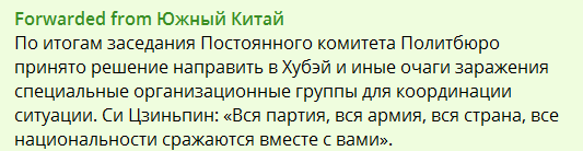 По итогам заседания Постоянного комитета Политбюро принято решение направить в Хубэй и иные очаги заражения специальные организационные группы для координации ситуации.
