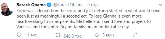 Экс-президент США Барак Обама написал в Твиттер: "Коби был легендой на поле и только начинал в том, что могло быть столь же значимым вторым актом. Потеря Джанны является еще более душераздирающей для нас как родителей. Мишель и я посылаем любовь и молитвы Ванессе и всей семье Брайанта в немыслимый день".