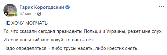 "Не хочу молчать. То, что сказали сегодня президенты Польши и Украины, режет мне слух. И если польский мне п.хуй, то наш – нет. Надо определяться – либо трусы надеть, либо крестик снять", заявил бизнесмен Гарик Корогодский.