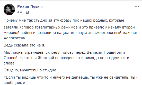 "Миллионы украинцев, склоняя голову перед Великим Подвигом и Славой, Честью и Жертвой не разделяют и никогда не разделят эти слова. Стыдно, мучительно стыдно. "Если ты видишь что-то и ничего не делаешь, ты уже не свидетель, ты - сообщник"", написала Елена.