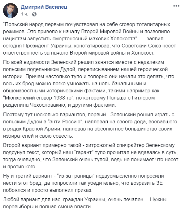 И в такой ситуации Зеленский вдруг делает заявление, которым максимально жестко становится на сторону Польши в этом конфликте. Да ещё и добавляет действительно бредовый со всех точек зрения пассаж об ответственности СССР за Холокост (да ещё и в день, когда советские войска освободили Освенцим).