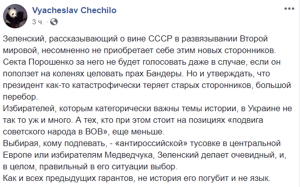 "Зеленский, рассказывающий о вине СССР в развязывании Второй мировой, несомненно не приобретает себе этим новых сторонников. Секта Порошенко за него не будет голосовать даже в случае, если он поползет на коленях целовать прах Бандеры. Но и утверждать, что президент как-то катастрофически теряет старых сторонников, большой перебор.