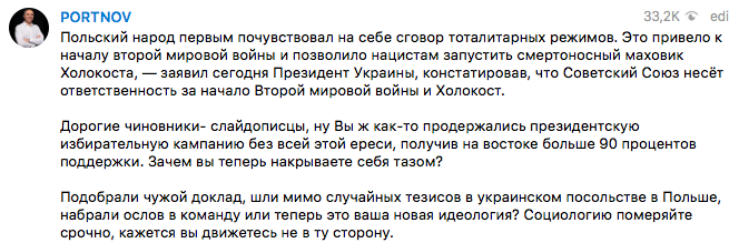 Подобрали чужой доклад, шли мимо случайных тезисов в украинском посольстве в Польше, набрали ослов в команду или теперь это ваша новая идеология? Социологию померяйте срочно, кажется вы движетесь не в ту сторону", - считает юрист Андрей Портнов.