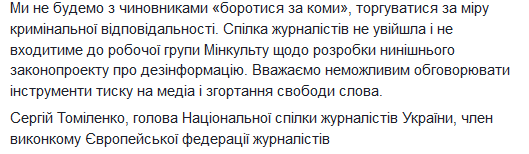 "Мы не будем с чиновниками "бороться за запятые", торговаться за меру уголовной ответственности. НСЖУ не вошел и не будет входить в рабочую группу Минкульта по разработке нынешнего законопроекта о дезинформации. Считаем невозможным обсуждать инструменты давления на медиа и формы ограничения свободы слова", - заявил Сергей Томиленко.