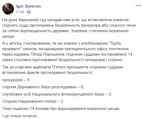 Головань пишет, что, основываясь на жалобах адвокатов, судьи установили факты противоправной бездеятельности у прокуроров - 4 случая; следователей ГБР - 6 случаев; должностных лиц НАБУ - 2 случая; следователей Нацполиции - 2.