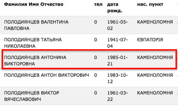 "Страна" нашла в телефонной базе жителей Украины единственную Антонину Полодиянцеву. Она 1985 года рождения. Место прописки - село Каменоломня Сакского района Крыма.