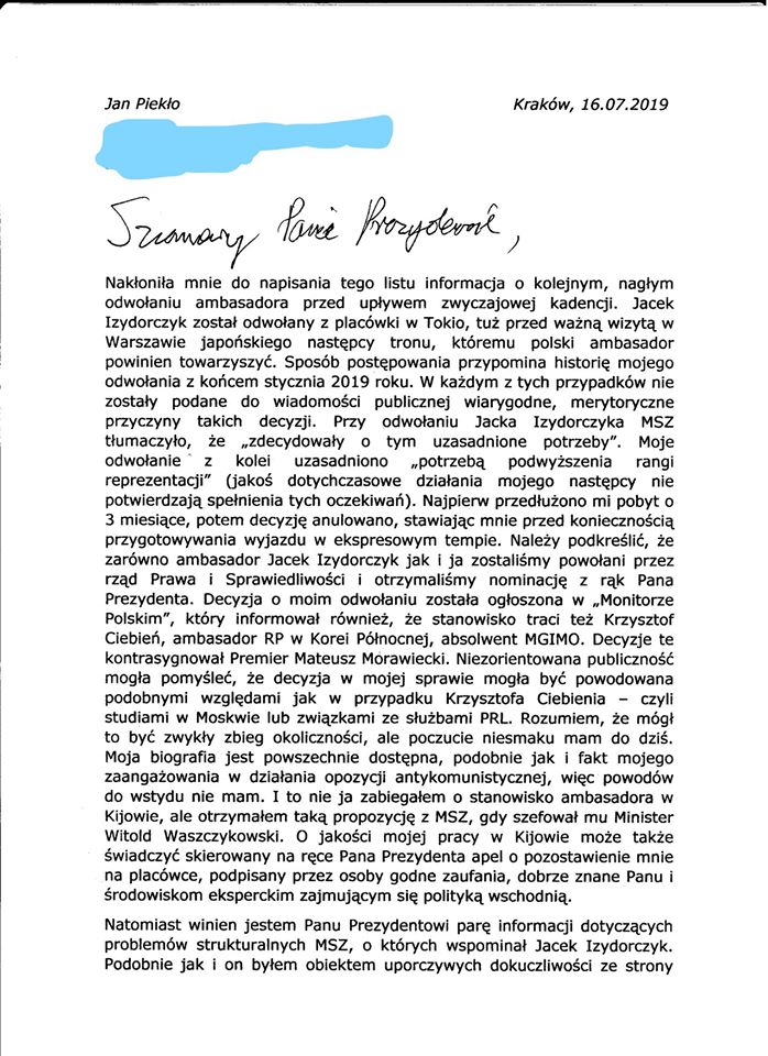 Бывший посол Польши в Украине Ян Пекло, которого уволили год назад, опубликовал содержание письма, которое он направил президенту Анджею Дуде в июле 2019 года. Пекло указывает, что его уволили не только до окончания срока, но и сделали это без обнародования "достоверных, содержательных" причин