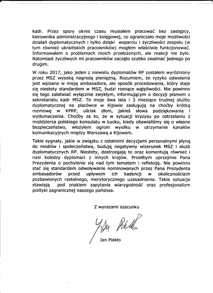 В то же время он отмечает, что его назначил правительство PiS и выдвинул Анджей Дуда. Пекло стал послом Польши в Украине в октябре 2016 года. Его срок полномочий был сокращен, и он покинул Киев ровно год назад.