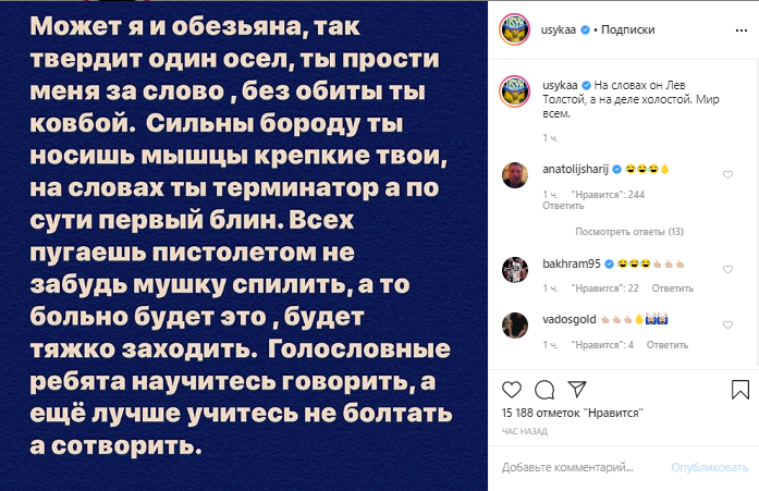 "Может я и обезьяна, так твердит один осел, ты прости меня за слово, без обиды, ты ковбой. Сильну бороду ты носишь, мышцы крепкие твои, на словах ты терминатор, а по сути первый блин. Всех пугаешь пистолетом, не забудь мушку спилить, а то больно будет это, будет тяжко заходить. Голословные ребята научитесь говорить, а еще лучше учитесь не болтать, а сотворить", - написал Усик.