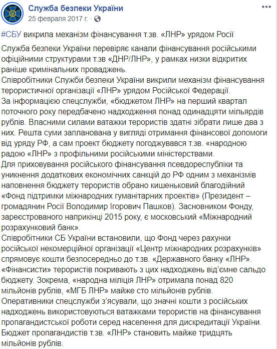 "По информации спецслужбы, "бюджетом ЛНР" на первый квартал текущего года предусмотрено поступление свыше одиннадцати миллиардов рублей. Собственными силами главари террористов способны собрать лишь два из них. Остальная сумма запланирована в виде получения финансовой помощи от правительства РФ. Для сокрытия российского финансирования псевдореспублики и чтобы избежать дополнительных экономических санкций к РФ, одним из механизмов наполнения бюджета террористов избран карманный благотворительный Фонд поддержки международных гуманитарных проектов (президент — гражданин России Владимир Игоревич Пашков)", - заявлялось в СБУ.