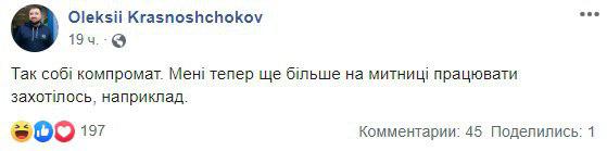 "Такой себе компромат. Мне теперь еще больше на таможне работать захотелось, например" - прокомментировал скандал Краснощеков.