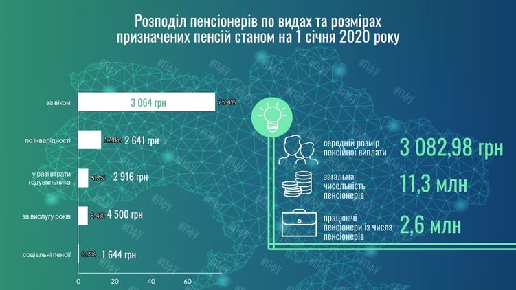 Представители фонда отметили, что 75,4% процентов всех пенсионеров начали получать выплаты по достижении пенсионного возраста. Средний размер их пенсии составляет 3064 грн. 12,8% пенсионеров получают пенсии по инвалидности (средняя - 2641 грн), 5,7% - в связи с потерей кормильца (средний размер - 2916 грн).