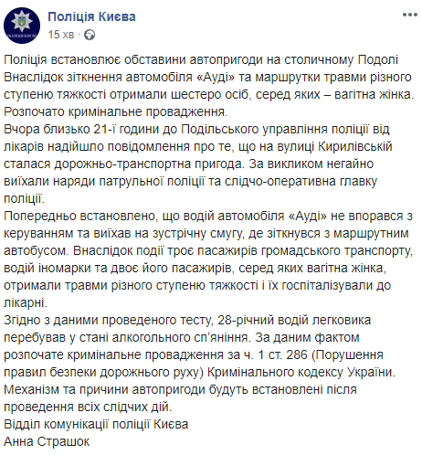 Сообщается, что вечером в четверг, 13 февраля, около 21:00 в отделение полиции поступило сообщение от врачей о том, что в центре Киева, на улице Кирилловской произошло ДТП.