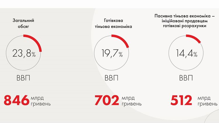 Согласно исследованию, 26,2% "наличной теневой экономики" – это "следственная теневая экономика", где инициаторами расчета наличными являются продавец и покупатель. Оставшиеся 73,8% от общего объема украинского теневой экономики (14,4% ВВП, или 512 млрд грн) – "пассивная теневая экономика", где инициатором соответствующего расчета является продавец.