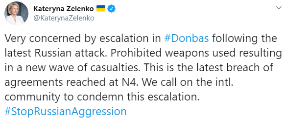 "Очень обеспокоены эскалацией конфликта на Донбассе после последней российской атаки. Использование запрещенного оружия привело к новой волне жертв. Это последнее нарушение договоренностей, достигнутых на встрече нормандской четверки. Мы призываем международное сообщество осудить эту эскалацию", - говорится в сообщении представителя МИД.