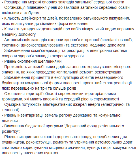 По словам Дубилета, показатели сформированы таким образом, чтобы все регионы могли "соревноваться" между собой. По началу таких показателей получилось около 100, однако Дубилет отметил, что с таким количеством критериев было бы невозможно работать, поэтому "пришлось чем-то жертвовать".