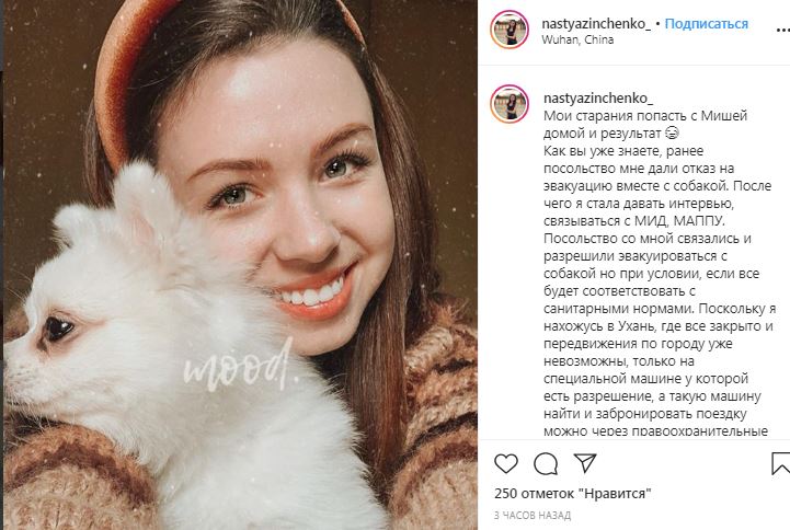 Анастасия написала про отказ эвакуировать ее вместе с псом из китайского Уханя еще 5 февраля. Девушка отметила, что подала заявление, отправила анкету, фото паспорта и визы для участия в эвакуации, но посольство отказало по причине того, что у нее есть собака.