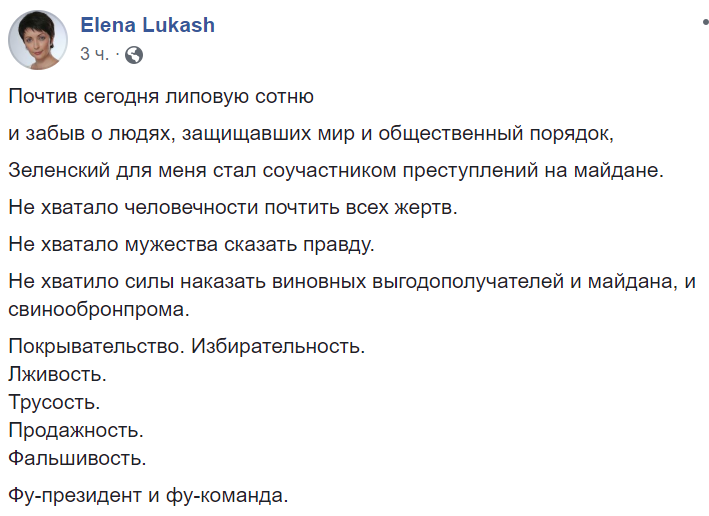 "Почтив сегодня липовую сотню и забыв о людях, защищавших мир и общественный порядок, Зеленский для меня стал соучастником преступлений на майдане.