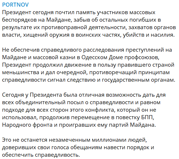 "Президент сегодня почтил память участников массовых беспорядков на Майдане, забыв об остальных погибших в результате их противоправной деятельности, захватов органов власти, хищений оружия в воинских частях, убийств и насилия.
