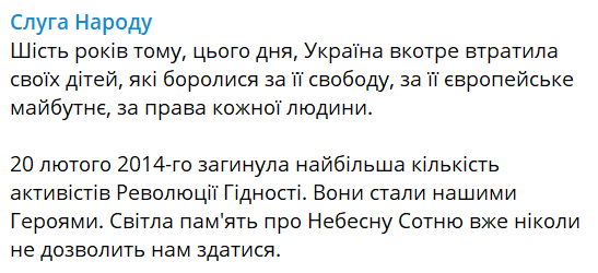 "Шесть лет назад, в этот день, Украина в очередной раз потеряла своих детей, которые боролись за ее свободу, за ее европейское будущее, за права каждого человека.