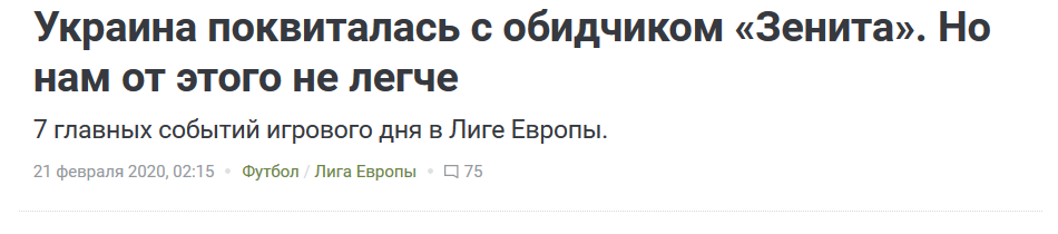 Один из ведущих спортивных ресурсов России, портал Чемпионат, свой отчет о плей-офф Лиги Европы и победе Шахтера над "орлами" назвал так - "Украина поквиталась с обидчиком Зенита. Но нам от этого не легче".