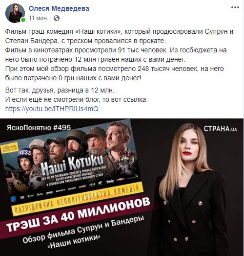 При этом обзор фильма на YouTube-канале "Страны", который провела в блоге "Ясно.Понятно" Олеся Медведева, посмотрело 248 тысяч человек. То есть, в 2,7 раза больше. "Фильм трэш-комедия "Наші котики", который продюсировали Супрун и Степан Бандера, с треском провалился в прокате. Фильм в кинотеатрах просмотрели 91 тыс человек. Из госбюджета на него было потрачено 12 млн гривен наших с вами денег. При этом мой обзор фильма посмотрело 248 тысяч человек, на него было потрачено 0 грн наших с вами денег!", - написала на своей странице в Facebook Олеся Медведева.