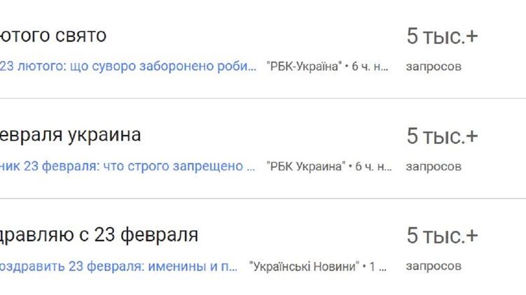 День 23 февраля - праздновавшийся в Украине как День защитника Отечества до 2014 года, но затем официально отмененный, вырвался в тройку лидеров запросов Google из Украины.