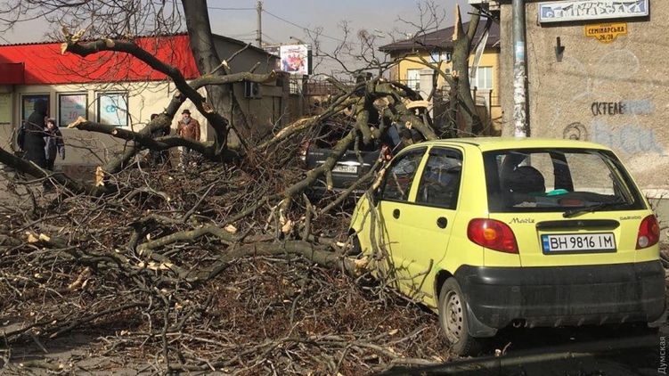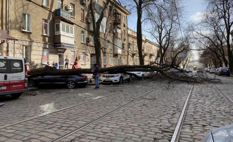 В то же время местные журналисты из "Думской", на улице Космонавтов два дерева рухнули на проезжую часть, заблокировав движение. А на Большом Фонтане сорвало конструкцию остановочного комплекса. Шквальный ветер бросил ее на парковку местного торгового центра: в результате повреждено несколько автомобилей.
